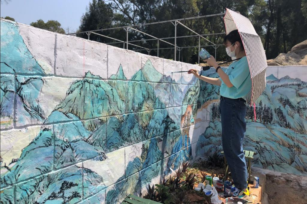 本学期再一次组织开展共建活动,对部队里的一堵长15米、高1米的围墙进行绘制。314日开始,41日下午六点结束,历时半个月,由党支部耿振、王舒怡、李曼熙、2016级国画团支部吴雨濛同学、2016级油画团支部郑海燕同学共5人主绘,部队官兵协助绘制,共同完成了一幅青绿山水巨作《峰春远山图》。