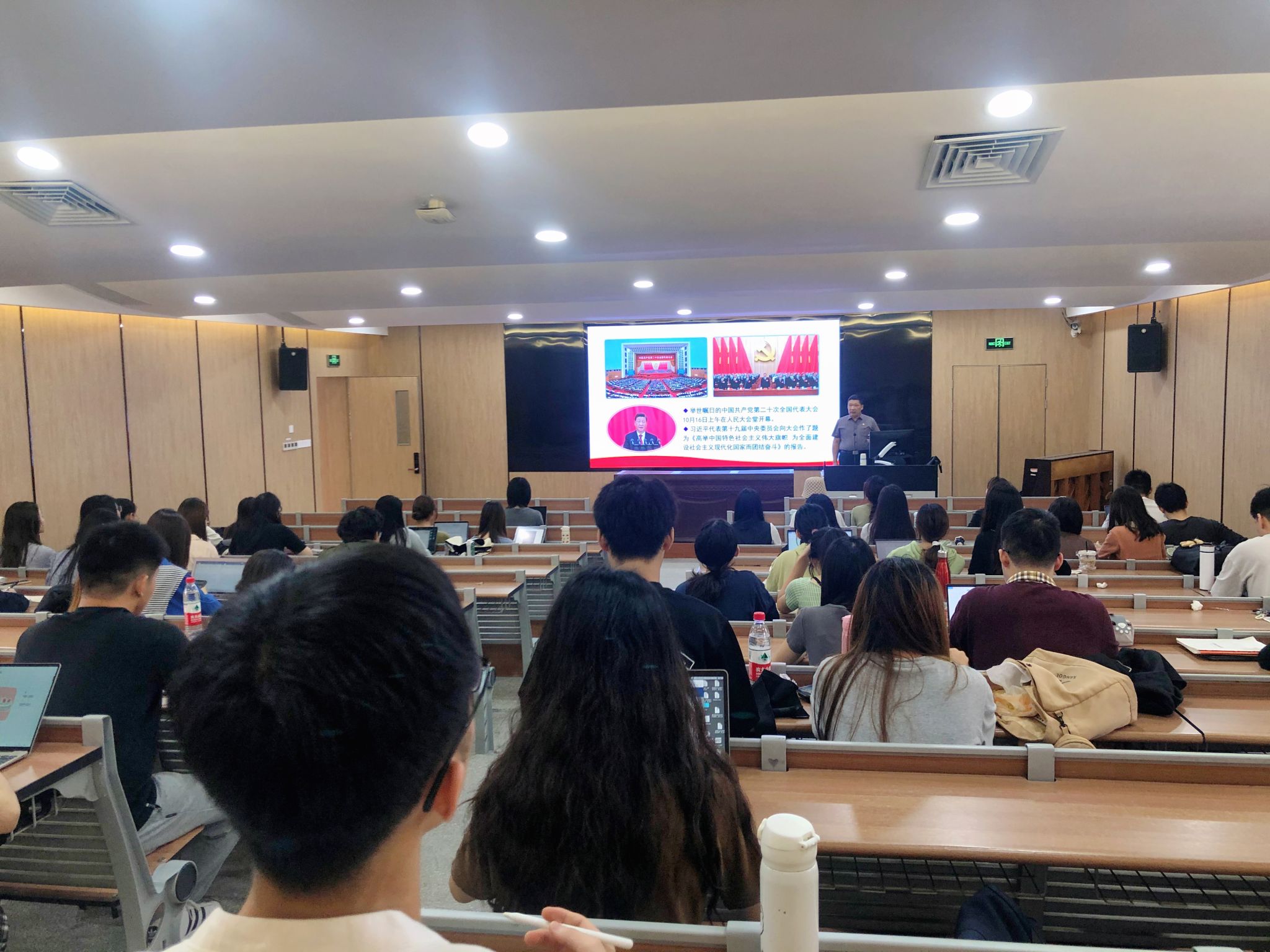在讲到新时代新征程中国共产党的使命任务时,苏劲教授慷慨激昂地说,“牢牢把握新时代10年伟大变革,满怀信心奔向新征程30年美好未来!”。在课堂上,苏劲教授为同学们深入解析党的二十大报告中提到的“中国式现代化”,从每一个小的分点出发,逐字逐句地带领着积极分子们体会和更深入地了解如今飞速发展的中国和伟大的中国共产党。最后,苏劲教授引用习近平总书记的话来激励在场的所有入党积极分子:青年强,则国家强。当代中国青年生逢其时,施展才干的舞台无比广阔,实现梦想的前景无比光明。
