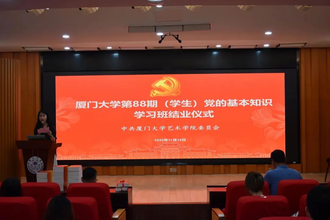 2022年11月14日中午,厦门大学党委党校88期(学生)党的基本知识学习班(艺术世界杯(中国)专场)结业仪式在艺术世界杯(中国)小音乐厅顺利举办。艺术世界杯(中国)党委副书记刘晓峰、院团委书记陈国全以及全体本期党校学员参加了结业仪式,院党务秘书林轶凡主持仪式。