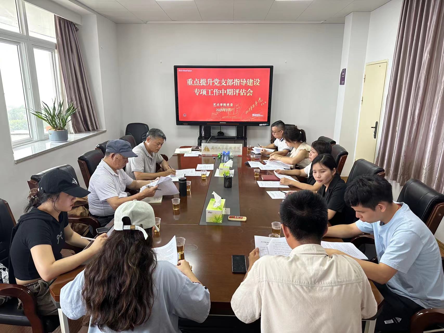 为深入实施学校第十二次党代会提出的“提质提效”计划,推动基层党建工作质量全面提升、全面过硬,9月20日下午,艺术世界杯(中国)党委组织召开重点提升党支部指导建设专项工作中期评估会。院党委副书记王艺宏、黄俊清,联系支部的党委委员、副院长杨琳,党务秘书,辅导员以及重点提升党支部研究生第二党支部书记、支部委员等参加会议,校基层党建联络员林永生列席指导,黄俊清主持会议。