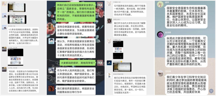 第五个全民国家安全教育日的主题是“坚持总体国家安全观,统筹传统安全和非传统安全,为全面建成小康社会提供坚强保障”。“同上一堂国家安全教育课”观看结束后,由各班级团支书组织学生开展有关活动主题的班级线上讨论,并结合当前疫情防控发表感想。虽然新冠感染使同学们分隔各地,但丝毫没有影响到同学们积极发言的热情。设计系2018级本科生胡华同学发表了自己的看法,她认为国家安全是国家生存和发展的重要保障,维护国家安全既是国家的责任,也是公民的责任,居安思危,让国家安全意识深入人心成为公众习惯应是全社会的期待。设计系2018级本科生安沛奇同学和范雨萌同学从当前疫情防控情况和加强青少年社会责任感两个方面,分享了观看安全教育课的心得,强调了完善而灵敏的疫情预警机制和严谨的疫情防控流程的重要性,并指出青少年在学习科学文化知识的同时,可以通过接受安全教育,提高思想政治觉悟和道德素质培养,从而增强对国家安全的社会责任感、义务感。