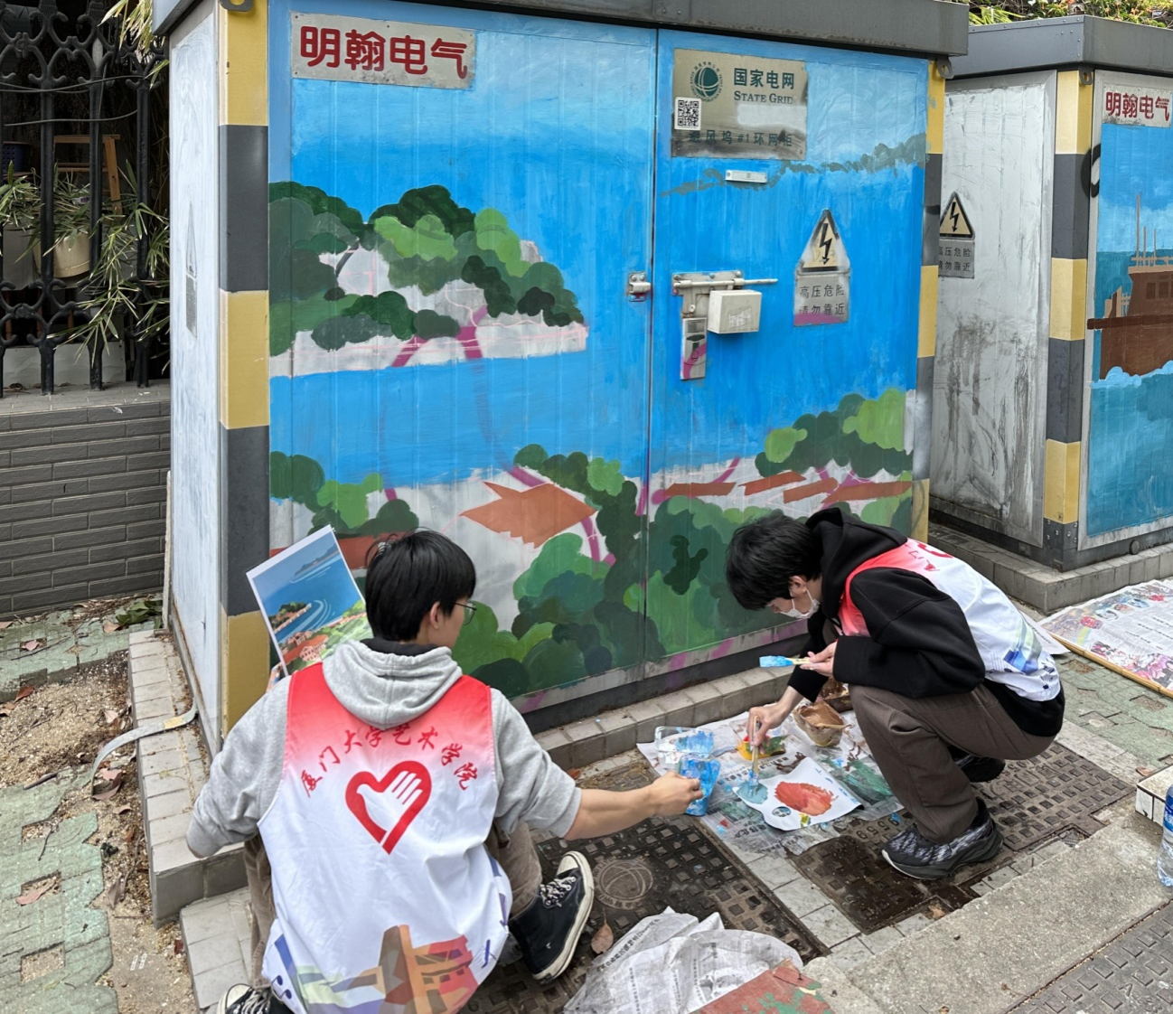 在艺术西区至大学路近500米的路段,来自世界杯官网研究生第一党支部的志愿者们分工协作:有的设计底稿、有的调制颜料、有的提笔作画。经过近8个小时站着作画,他们为沿线的10个变电箱画上了双子塔、帆船、海洋、白鹭等具有城市特色的图案。色彩缤纷、灵动优美的作品引得不少来往的市民、游客驻足观看,还有人在志愿者的引导下体验上色过程。