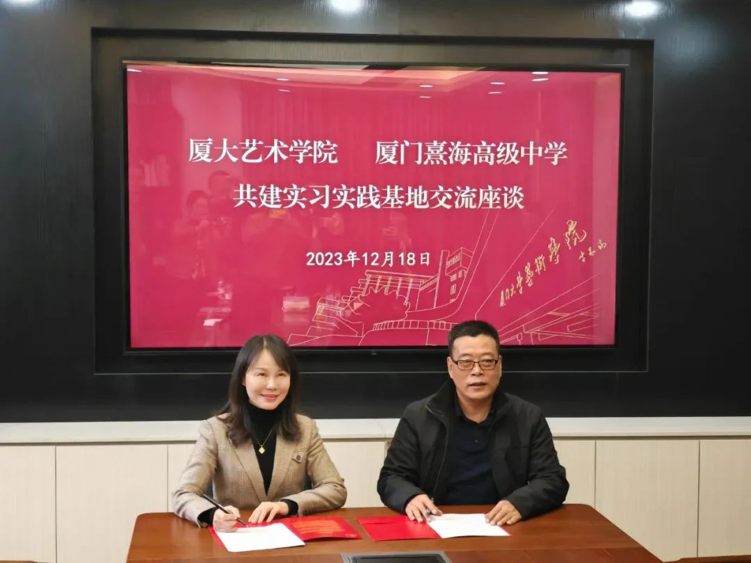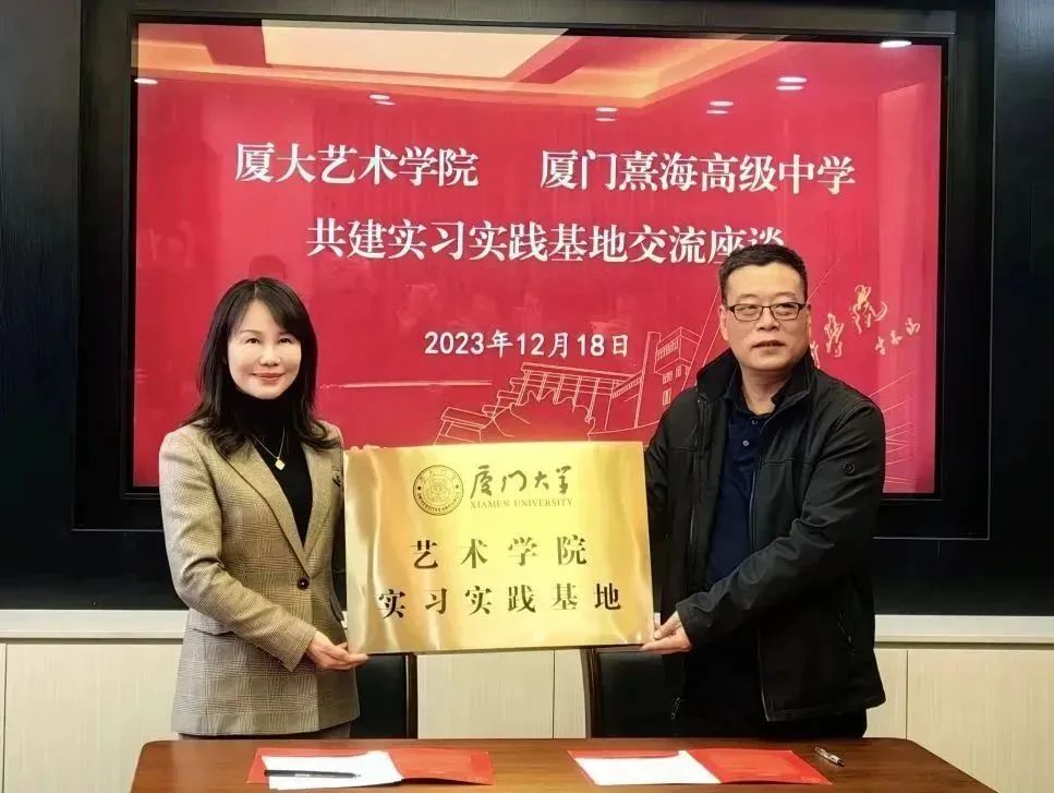 厦大艺术世界杯(中国)常务副院长吴荣华与厦门熹海高级中学负责人郑希签订共建实习实践基地协议并进行授牌仪式。