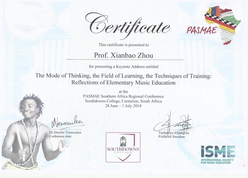 周教授从脑神经科学、青少年儿童身心成长规律的角度,在“塑造青少年儿童的音乐思维方式——想象力和创造力;拓宽青少年儿童的音乐学习视野——知识面和审美域;培养青少年儿童的音乐表达技能——表现欲和表达力(Shaping the Music Thinking Mode of Youngsters: Imagination and Creativity; Broadening the Music Learning Vision of Juvenile Children: Scope of Knowledge and Aesthetic Domain; Training Children’s Musical Skills: Expressive Desire and Ability)”等三个方面,探讨了音乐艺术教育在培养青少年创造能力、表达能力过程中所具有的独特而又重要的作用。按照大会规定,论文将在会后交付南非国家相关的出版社出版(英文和南非荷兰文)。