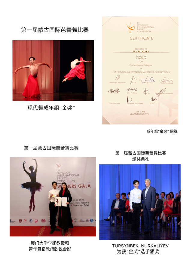 我院李娜教授携青年舞蹈教师欧锐、舞蹈研究生陈祎超参加比赛。欧锐、陈祎超两位选手凭借原创作品《New Life》、《Rainy Night》挺进决赛,最终,欧锐以优异的成绩荣获现代芭蕾舞成年组金奖,李娜获唯一最高奖“最佳编舞奖”。比赛结束后,欧锐获得各国评委的一致好评,评委们热情邀请并推荐其参加各国文化交流活动。