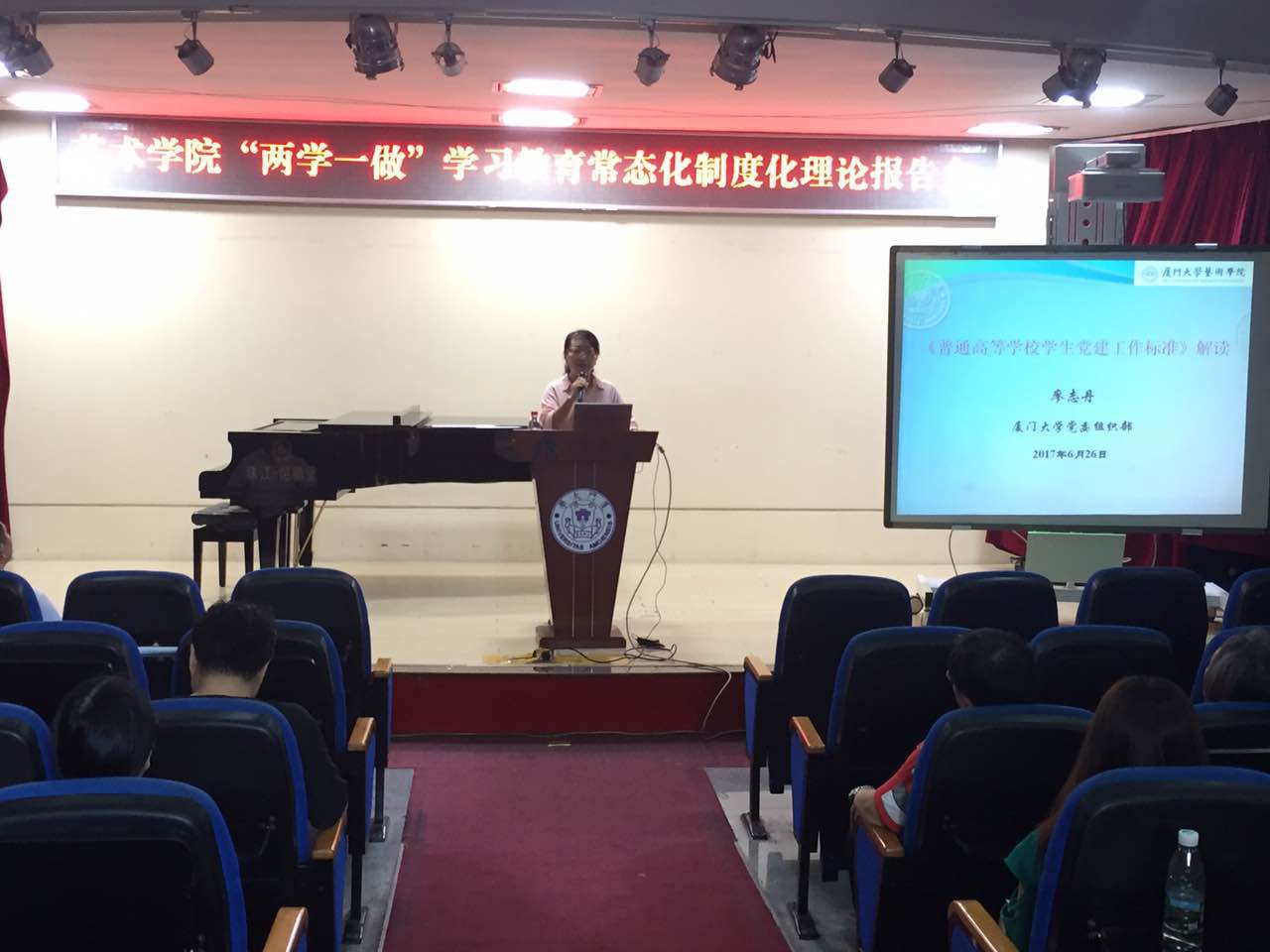 6月26日下午,由艺术世界杯(中国)党委党校主办的“两学一做”学习教育常态化制度化理论报告会邀请到校党委组织部副部长廖志丹副教授来世界杯(中国)作《普通高等学校学生党建工作标准》解读讲座,参加讲座的有院党委书记何元赞、党委委员、教工党支部书记、政工口干部和全体学生党员。讲座由院党委副书记邹江涛主持。