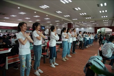 紧接着,“第三梯队”的同学们从人群中错落站起,边唱边跳起了《我们都是追梦人》,同学们冲出食堂,与表演手语歌曲《国家》的同学们汇合。最后,大家掏出了一面面鲜艳的五星红旗,挥舞着唱起了《光荣啊!中国共青团》。一齐喊出 “‘艺’气风发,青春领航,2017级音乐教育团支部共展青年力量,为祖国歌唱!”的口号,一张张青春洋溢的脸、整齐的白T恤、胸前闪亮的团徽,既展现着这个团支部爱祖国、有才华、青春热血的精神风貌,也代表着无数个同样怀抱梦想、充满朝气的青年团体敢于奋斗、勇于拼搏的自强精神。