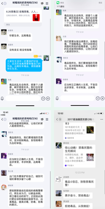 观看结束后同学们以支部为单位分别就两部短片开展线上讨论,“181年前,林则徐虎门硝烟抵御外敌、振兴民族,告诫我们勿忘历史,牢记使命。然而2020年的今天,社会中仍存恶之花借毒品非法敛财、为非作歹,将罪恶的双手伸向迷途中的羔羊。我们要有意识地培养健康的心理和良好的生活习惯,要谨慎地择交朋友和高度的警觉和自制,珍爱生命,拒绝毒品”,2019级本科生张雨今同学在观影后有感而发。“《惊心动魄!禁毒民警的生死瞬间》这部短片记录了冲在禁毒第一线的民警们惊心动魄的生死瞬间,让人不由得敬仰那群在枪战、搏斗、爆炸、追击中浴血斗争的禁毒英雄们。‘珍爱生命,远离毒品’,永远不是一句口号,我们要实实在在的行动起来,向禁毒民警们致敬”,2018级国画班团支部书记张彧这样说道。
