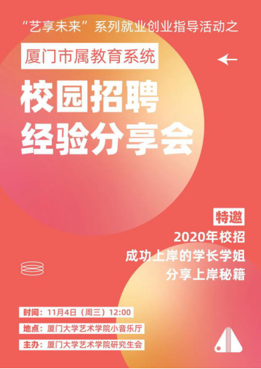 11月4日中午,在艺术世界杯(中国)小音乐厅,艺术世界杯(中国)研究生会成功举办本学年第一场“艺享未来”系列就业创业指导活动之厦门市属教育系统校园招聘经验分享会。分享会邀请到我院在此次厦门市属教育系统校园招聘中成功“上岸”的2021届毕业生方舒晴学姐和黄荷艳学姐,分别从音乐和美术的学科专业角度为同学们带来了有关教师招聘的经验分享。