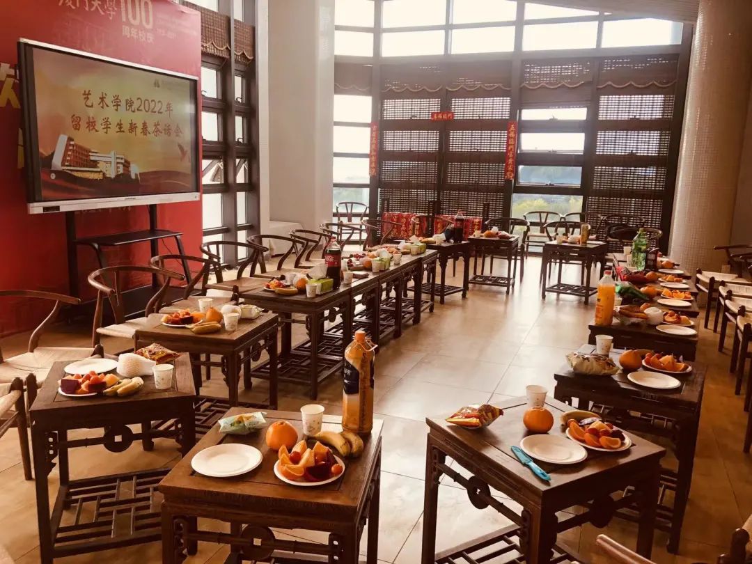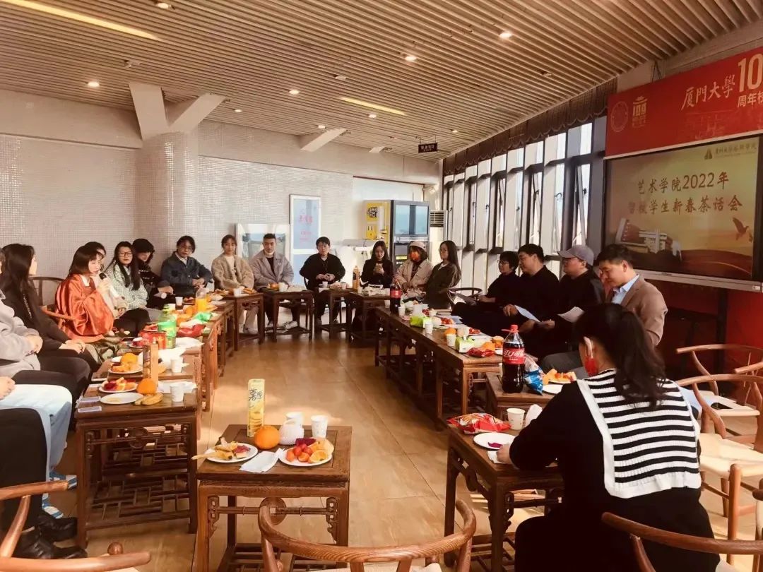 除夕夜的钟声近在咫尺,留校师生们虽身处异乡、但不为异客在茶话会热烈的氛围里欢聚一堂品尝着厦大暖冬独特的新年滋味。活动开始前,工作人员已将会场精心布置好:小方桌紧挨着围成一圈,饮料、零食、各色果品应有尽有,红色的灯笼让人嗅到熟悉的年味儿。