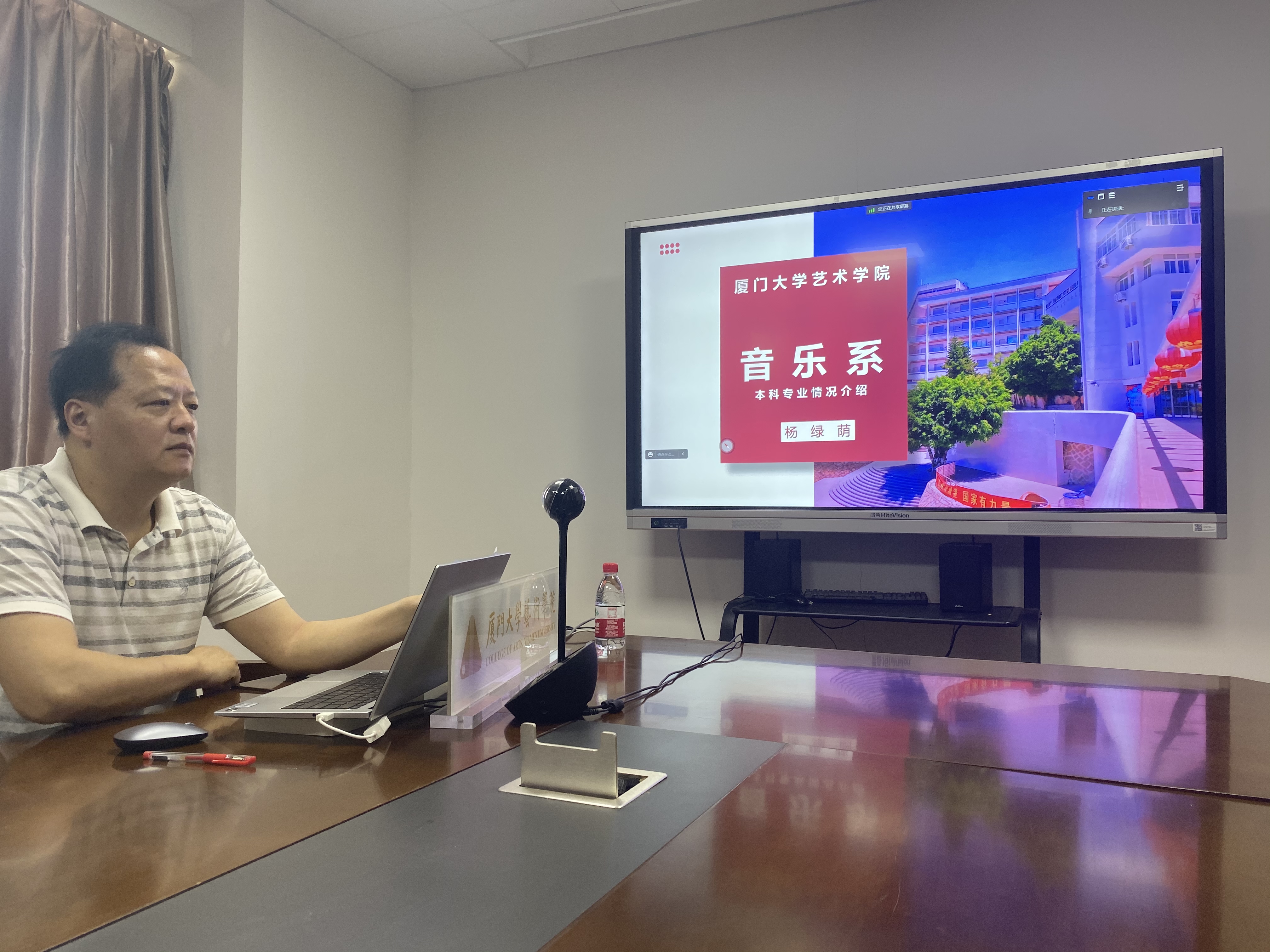 宣讲伊始,刘涛副院长对今天观看直播的学生和家长进行了热烈的欢迎,就艺术世界杯(中国)整体情况做了简单的介绍。紧接着音乐系副主任杨绿荫副教授以图文结合的形式简述了厦大艺术世界杯(中国)与音乐系的发展历程与概况,并从学科简介、专业方向、学科发展优势等几方面深入浅出地介绍了我院音乐系的课程设置、教研室教师构成和各个专业的实践成果。其中,杨绿荫副教授重点突出了音乐系依托厦大这一资源丰厚的母体为学子们带来的充分的国际交流机会与本土艺术文化研究平台的优势,鼓励同学们根据自己的实际情况和兴趣选择适合自己的专业方向。