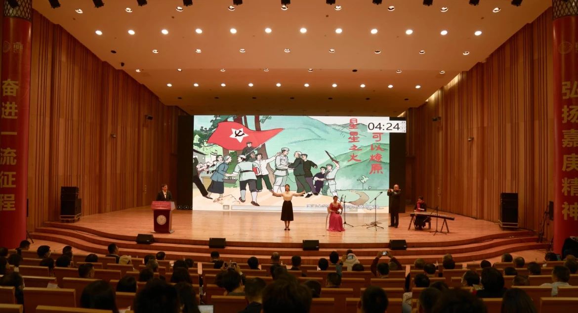现场展示了艺术党课片段缩影《映山红》,叶飞声,段言,张佳康三位老师演绎民乐合奏,导聆李倩同学结合党史,讲述歌声中的井冈山精神,黃穎同学用画笔描绘了苏区军民的鱼水深情。师生的精彩演绎赢得一片好评。