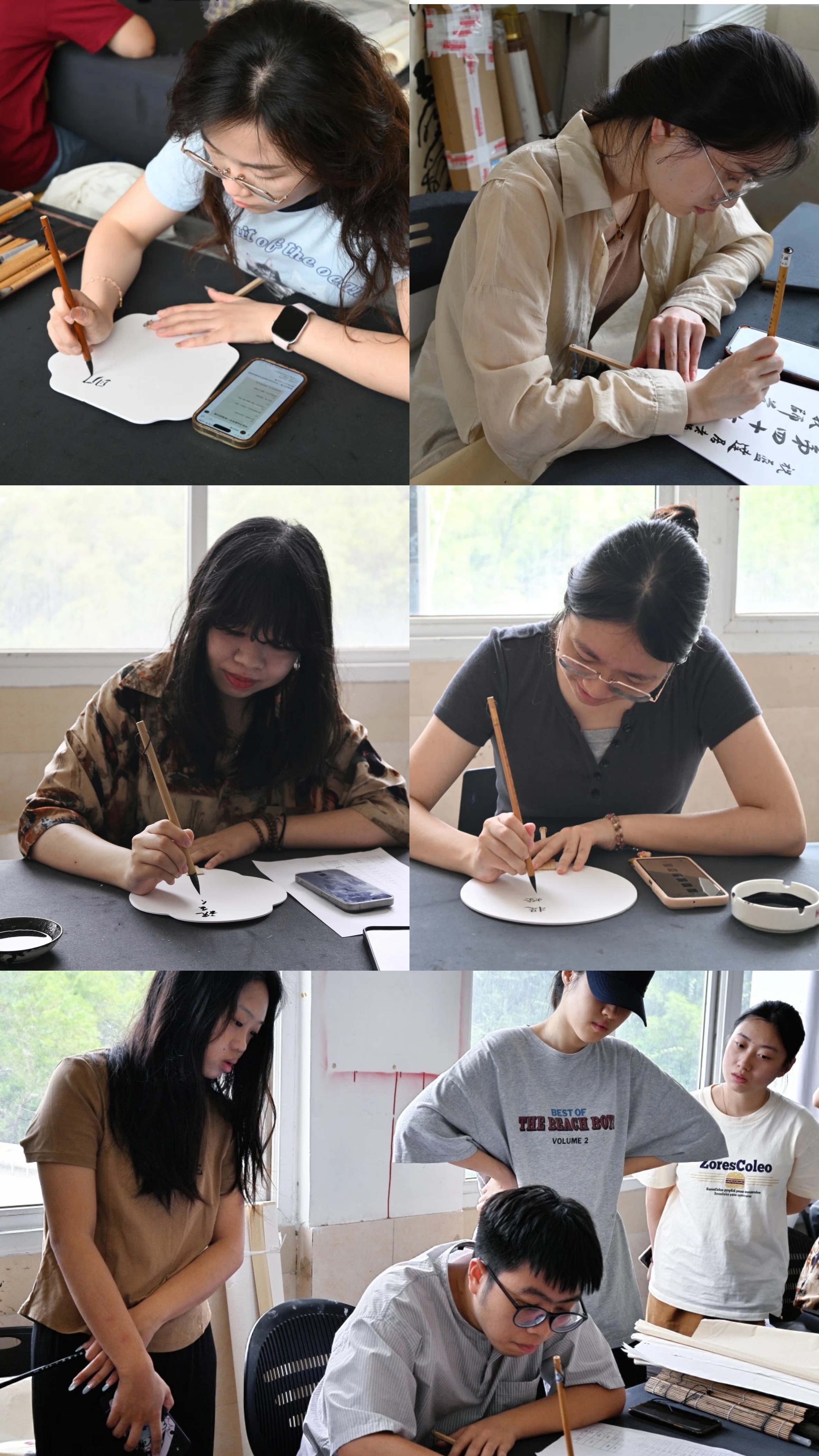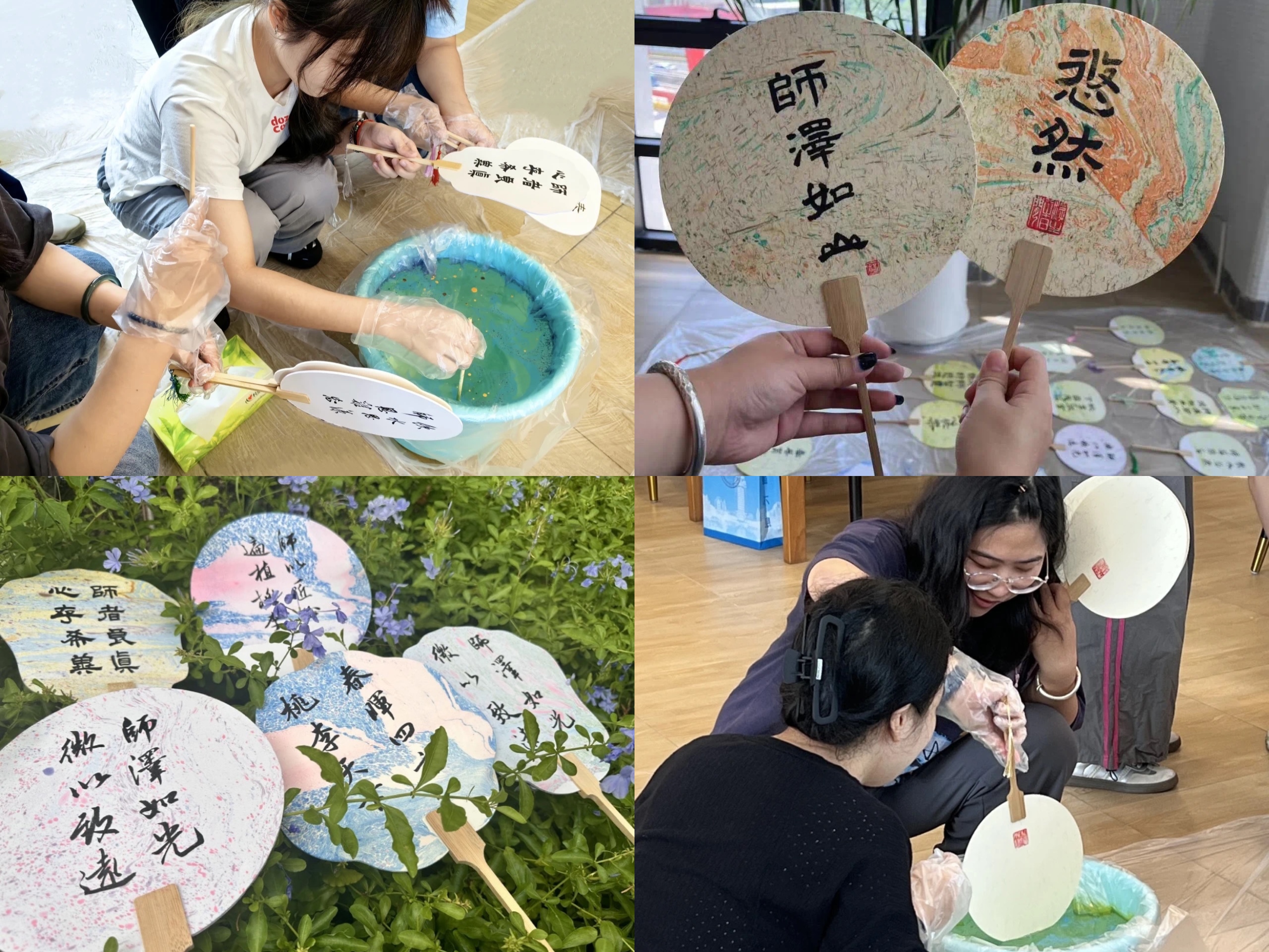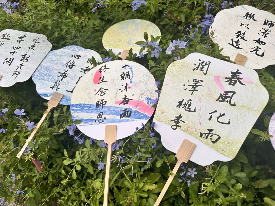 书法环节,墨香四溢。同学们纷纷提笔,在团扇上挥毫泼墨。隶书、楷书、行书、篆书,字体或刚劲有力,或温婉灵动。一笔一划,书写着对老师们的敬意与感恩;一撇一捺,蕴含着对老师们的祝福与关怀,展现出同学们的书法功底和艺术魅力。