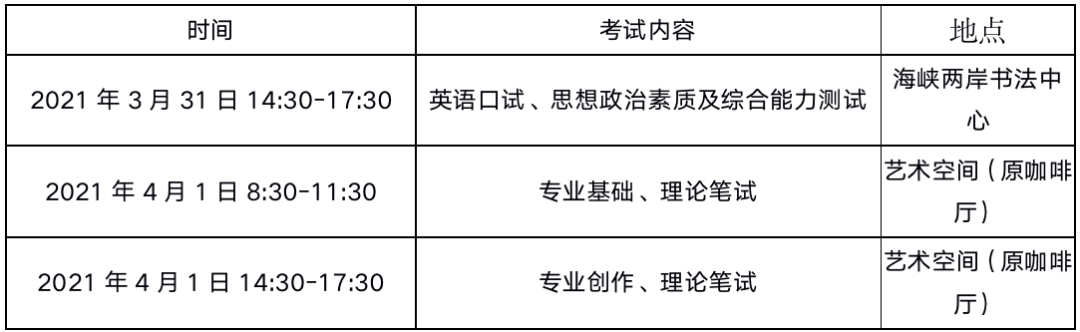 调剂考生于2021年3月31日上午9:00-11:00携带本人以下材料至我院海峡两岸书法中心接受审查: