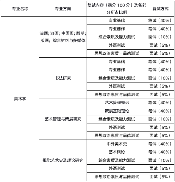2. 考生按美术学绘画(油画、漆画、中国画、雕塑与公共空间艺术、书法研究、版画研究、综合材料与多媒体)以总成绩从高分到低分排名。视觉艺术史及理论研究和艺术管理与策展研究分别以总成绩从高分到低分分别排名。