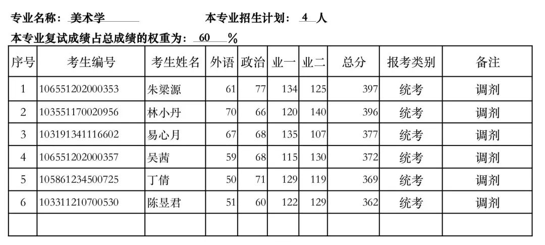 1. 根据招生计划,按各专业(或方向)实际情况和考生总成绩(总成绩=初试成绩÷5x40%+复试成绩(百分制)x60%)并结合考生思想政治表现、业务素质以及身体健康状况等因素,择优确定拟录取名单,2021年世界杯官网拟招收4名美术学研究生(调剂),其中绘画3名,艺术管理与策展研究1名。