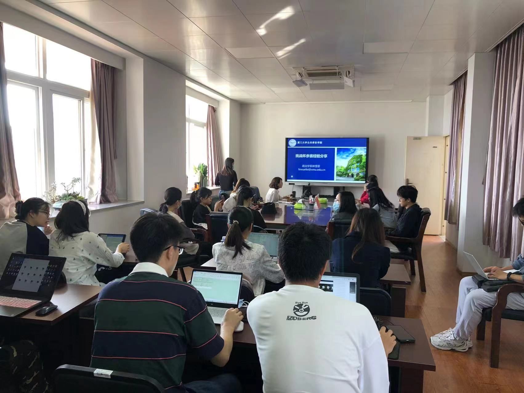 几位同学就自己的项目进行了汇报,林老师对学生的问题进行了指点和修正,在此过程中老师和学生们互相交流意见和想法,为挑战杯的后续工作进行了铺垫。之后研究生们来到现场分享历年的比赛经历,林老师在旁提出观点与建议,大家一起分享,探讨各自的观点与经验,思想在此碰撞与交融。